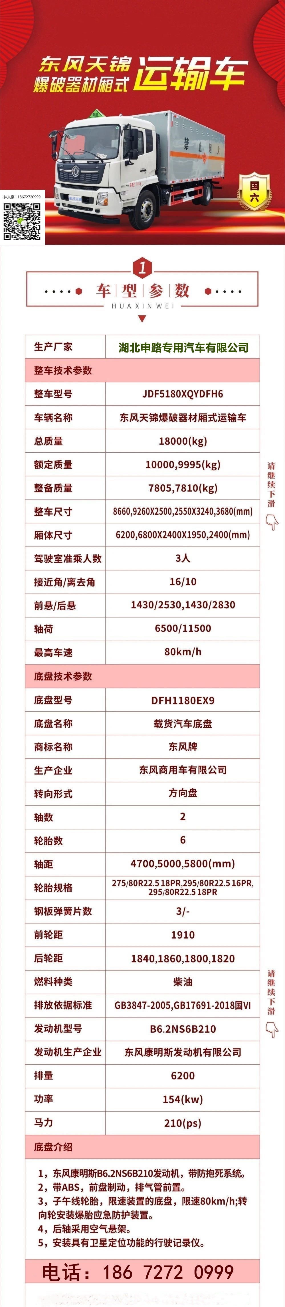 配置:東風(fēng)天錦D530VR排半駕駛室,底盤型號:DFH1180EX9,原廠危險品底盤,6缸康明斯B6.2NS6B210發(fā)動機,210馬力,國六排放,陜齒8JS85E-C變速箱,前4.5,后9噸,4700mm軸距,275真空胎,鋁合金160L油箱,帶空調(diào),電動玻璃,中控鎖,行車記錄儀,前盤后鼓,ECU限速,ABS,北斗,排氣制動,排氣管前置,帶防火罩,后橋空氣懸掛,有環(huán)保,有燃油,安全達標。 ??方向??助力,空調(diào),中控鎖,電動玻璃,3/4+5雙層板簧,前盤制動,ABS、離合助力、 排氣制動、動力轉(zhuǎn)向,限速裝置,排氣管前置+防火罩等。車門位置裝攝像頭+顯示屏