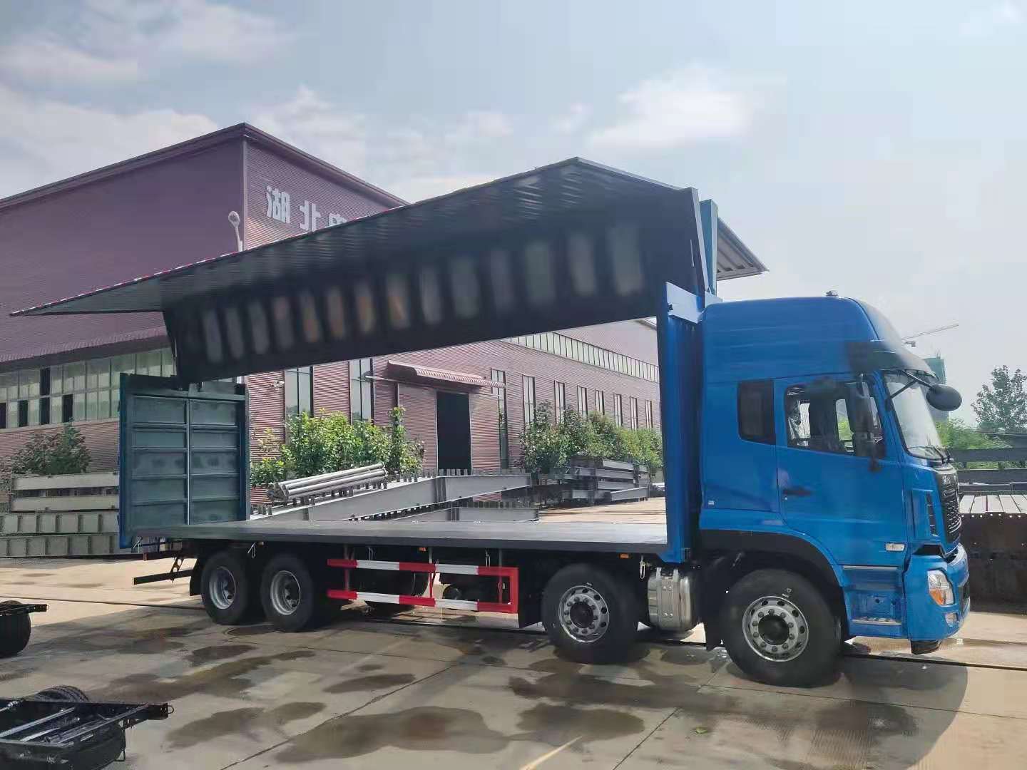 鋼板,外表防滑,美觀耐用,并帶有臥環(huán)防止貨物左右晃動。左右兩側雙飛翼液